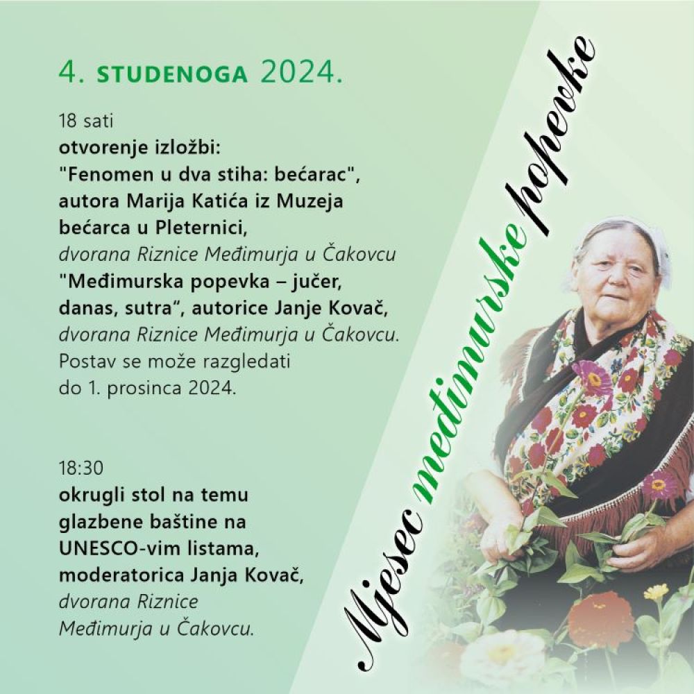 U sklopu programa Mjeseca međimurske popevke u Muzeju Međimurja - Multimedijalna dvorana Riznice Međimurja, u ponedjeljak 4. studenoga u 18 sati održat će se otvorenje dviju izložbi „Fenomen u dva stiha: bećarac“ autora Marija Katića iz Muzeja bećarca u Pleternici i „Međimurska popevka – jučer, danas, sutra“ autorice Janje Kovač iz Muzeja Međimurja Čakovec.