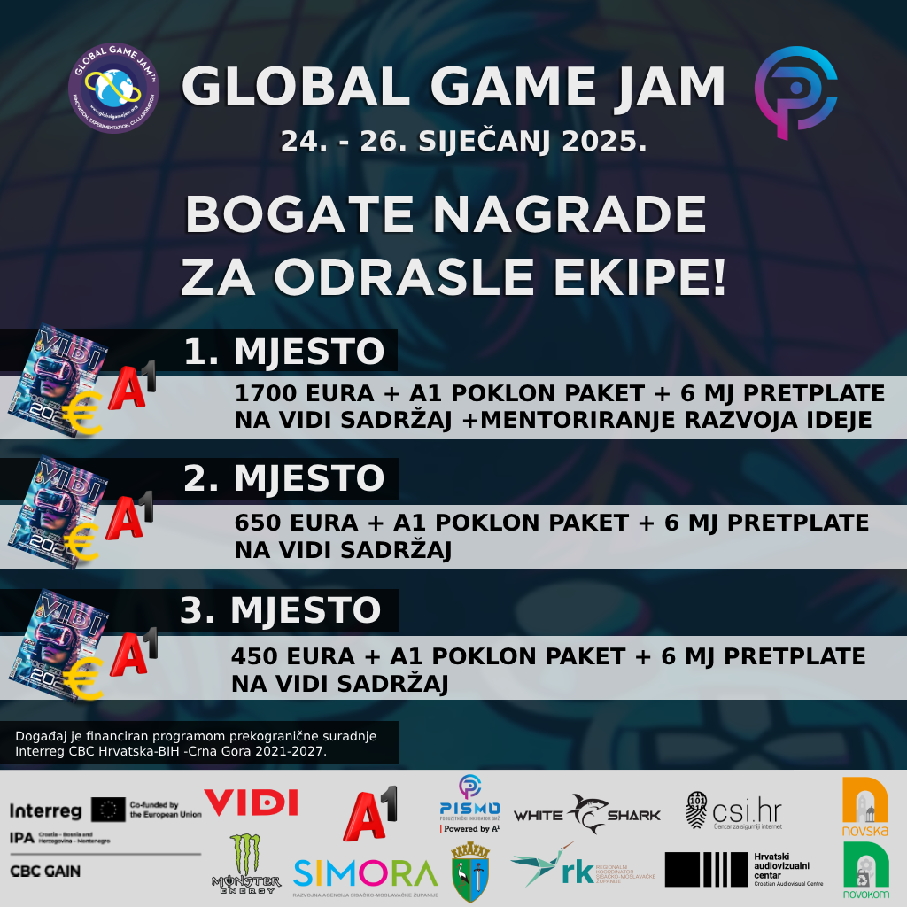 Natjecanje je podijeljeno u dvije kategorije – za odrasle i srednjoškolce. Ove godine pripremljen je bogat nagradni fond koji uključuje novčane iznose, vrhunsku gaming opremu i mentoriranje razvoja pobjedničke ideje. Za odrasle, nagrade osiguravaju inkubator PISMO, A1 Hrvatska i VIDI medijska kuća. Pobjednička ekipa osvojit će 1.700 eura, A1 poklon paket, šest mjeseci pretplate na VIDI sadržaj te mentoriranje razvoja pobjedničke ideje. Drugo mjesto donosi 650 eura, A1 poklon paket i šest mjeseci pretplate na VIDI sadržaj, dok treće mjesto osigurava 450 eura, A1 poklon paket i šest mjeseci pretplate na VIDI sadržaj.