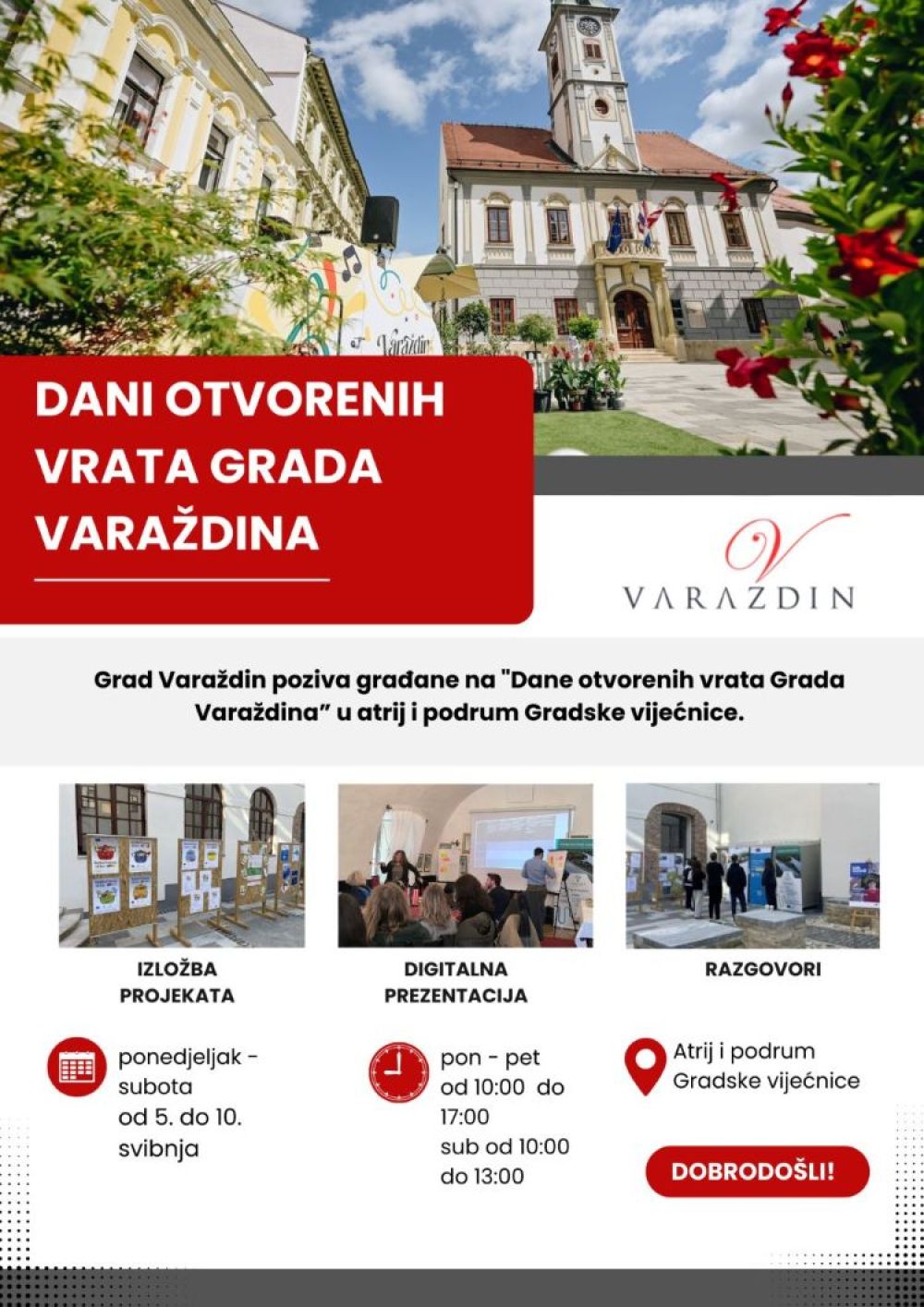 Grad Varaždin poziva svoje građane na Dane otvorenih vrata koja će se održati od 5. do 10. svibnja. U novouređenom atriju i podrumu Gradske vijećnice bit će prikazani brojni projekti koji oblikuju Varaždin kao suvremen, inovativan, održiv i uključiv grad – infrastrukturno, kulturno, zeleno i društveno.