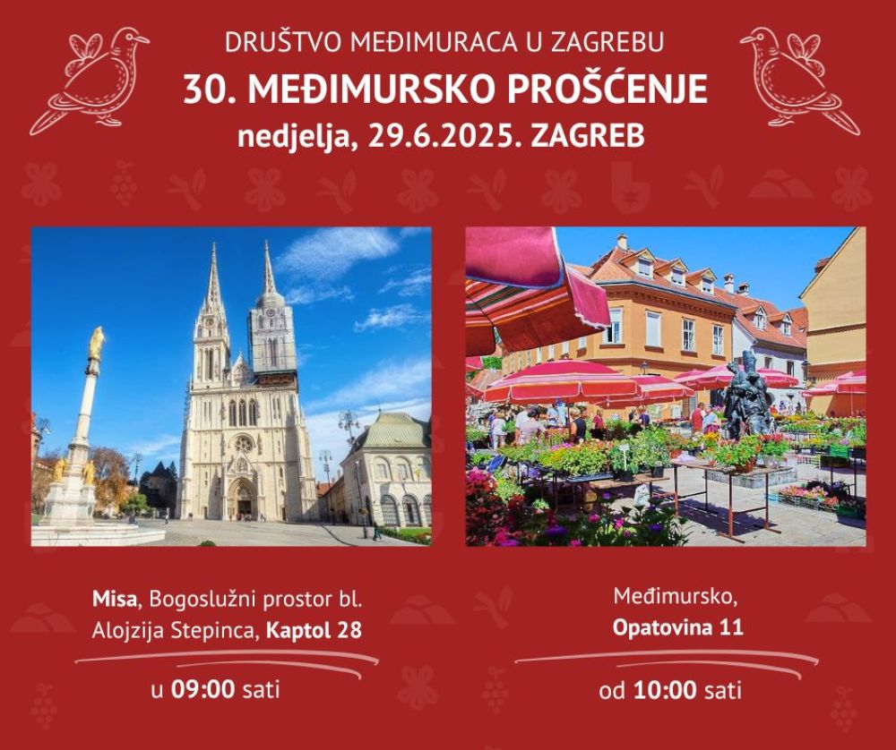U organizaciji Društva Međimuraca u Zagrebu, u nedjelju, 29. lipnja, održat će se 30. Međimursko prošćenje, tradicionalno okupljanje Međimuraca, njihovih prijatelja i svih ljubitelja međimurske kulturne i gastronomske baštine.