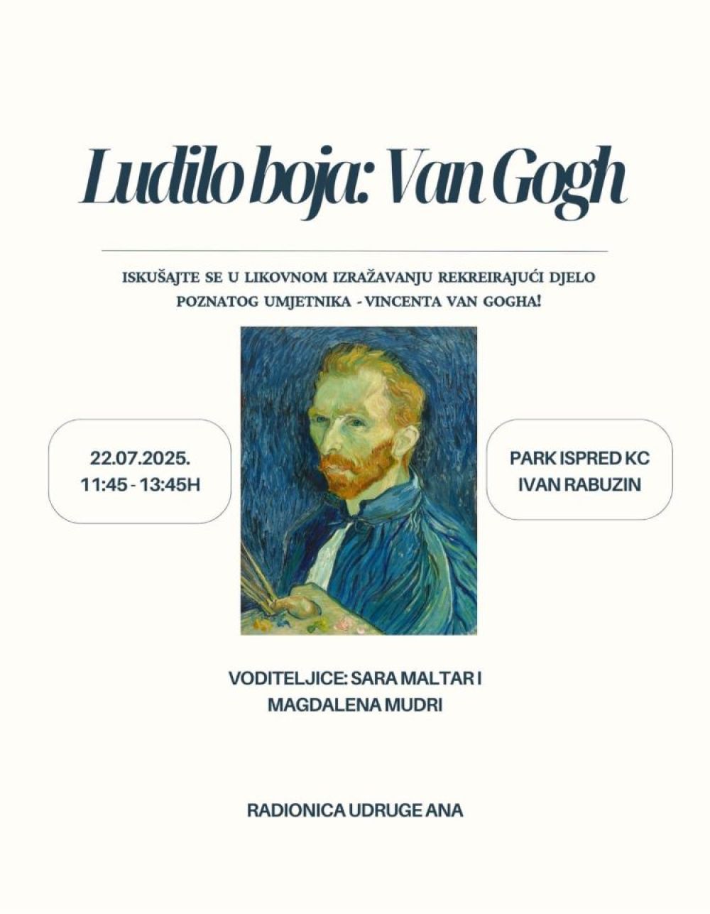 Radionica će se održati od 11:45 do 13:45 sati u Parku ispred Kulturnog centra Ivan Rabuzin, a kroz zanimljive aktivnosti inspirirane djelima Vincenta van Gogha, djeca će imati priliku istraživati boje, umjetnost i vlastitu kreativnost.