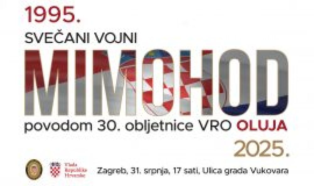 ovim putem vas želimo obavijestiti kako će za vrijeme održavanja svečanog vojnog mimohoda u Zagrebu u četvrtak, 31. srpnja 2025. godine iu utorak, 29. srpnja 2025. godine, prilikom održavanja opće probe vojnog mimohoda na snazi biti posebna regulacija prometa te će neke od prometnica biti privremeno zatvorene zbog prolaska tehnike i mehaniziranih postroja Hrvatske vojske.