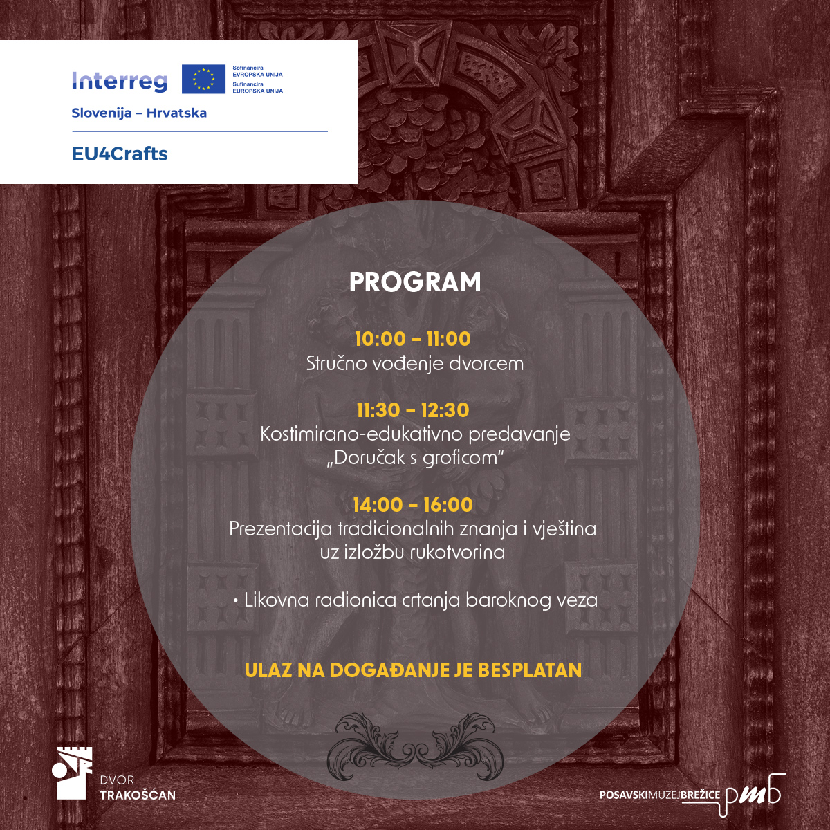 Dan započinje stručnim vođenjem kroz raskošne prostorije dvorca, gdje kustosi Dvora Trakošćan vode posjetitelje kroz baroknu sobu, knjižnicu i zbirku starinskog namještaja, približavajući im život aristokracije tog doba. U nastavku slijedi posebno kostimirano predavanje „Doručak s groficom“, koje na zanimljiv i edukativan način spaja povijesne činjenice s atmosferom vremena u kojem su živjeli plemići i plemkinje. Poslijepodne je rezervirano za kreativnost i tradiciju – posjetitelji će moći sudjelovati u prezentaciji tradicijskih znanja, razgledati izložbu rukotvorina i okušati se u likovnoj radionici inspiriranoj baroknim vezom.