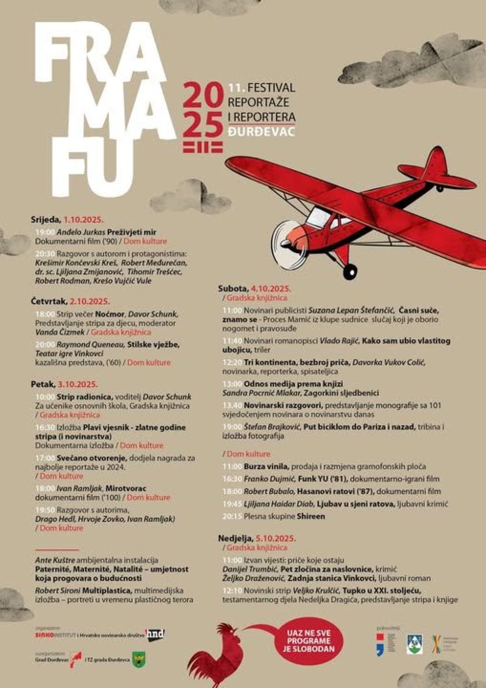 Jedanaesto izdanje Festivala reportaže i reportera Fra Ma Fu održat će se u Đurđevcu od 1. do 5. listopada. Festival posvećen slavnom reporteru piscu, pjesniku i autoru scenarija za stripove Franji Martinu Fuisu (Virovitica, 1908. – Plitvice, 1943.), jednom od najistaknutijih novinara tridesetih godina prošlog stoljeća, donosi niz novinarskih razgovora, književnih promocija, filmskih projekcija i radionica. U programima sudjeluje 90 novinara, pisaca, pjesnika, glumaca i glazbenika.