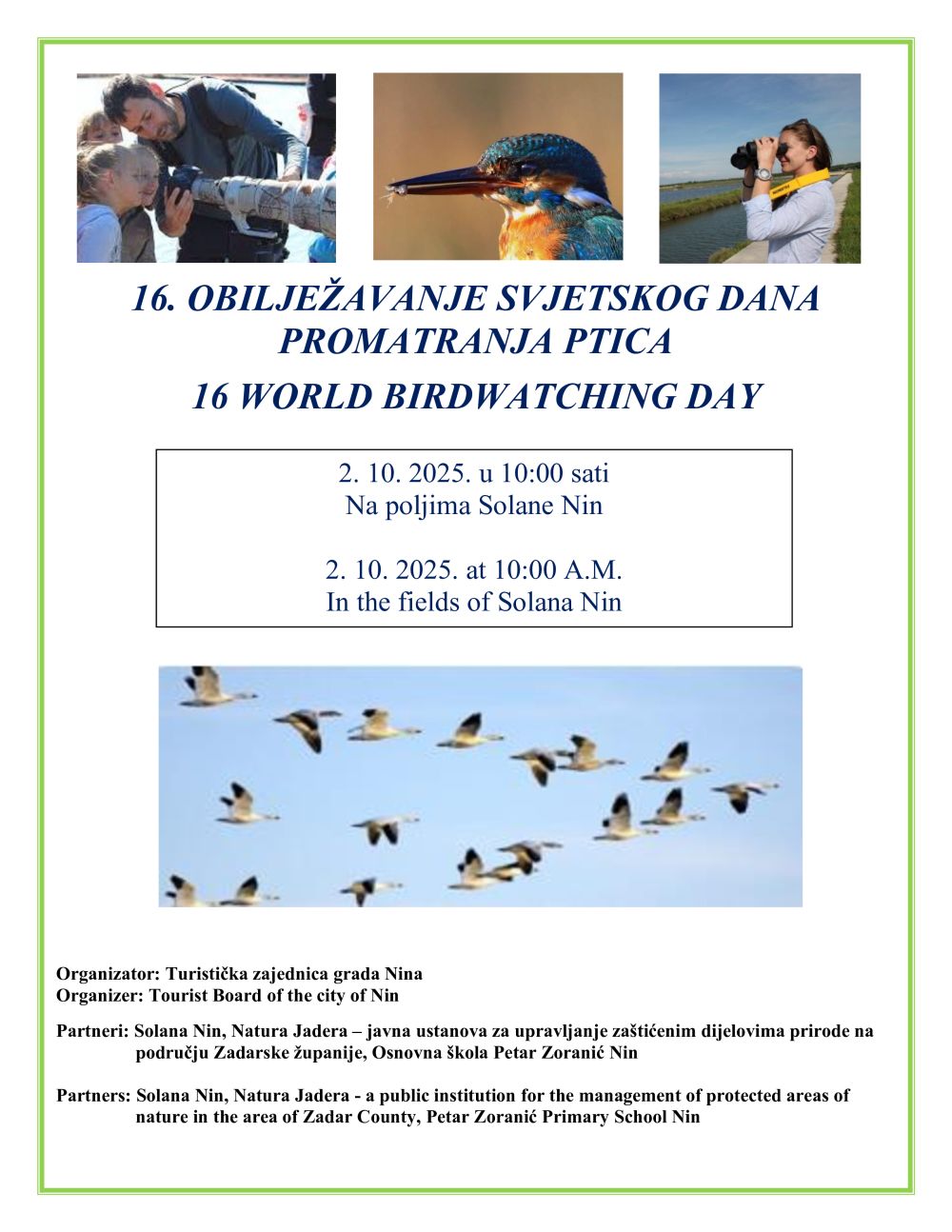 Turistička zajednica grada Nina 16. godinu zaredom organizira i poziva na Obilježavanje Svjetskog dana promatranja ptica, 2. listopada s početkom u 10 sati na poljima Solane Nin.