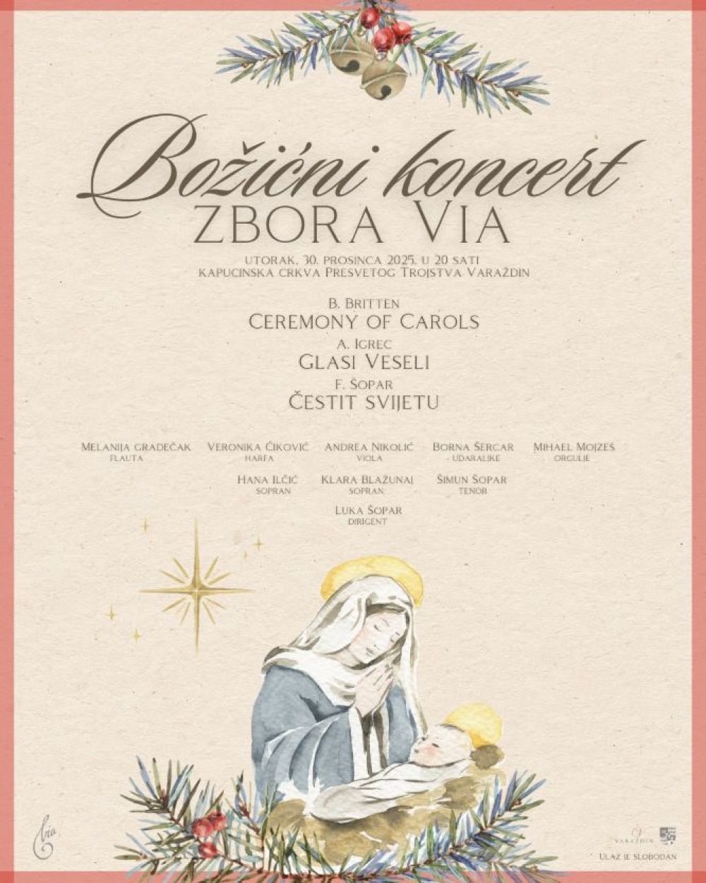 Dobrodošli na Božićni koncert zbora Via Varaždin koji će se održati u utorak, 30. prosinca u 20 sati u kapucinskoj crkvi Presvetog Trojstva u Varaždinu uz "Glase vesele" Anđelka Igreca, "Ceremony of Carols" Benjamina Brittena i "Čestit svijetu" Filipa Šopara.