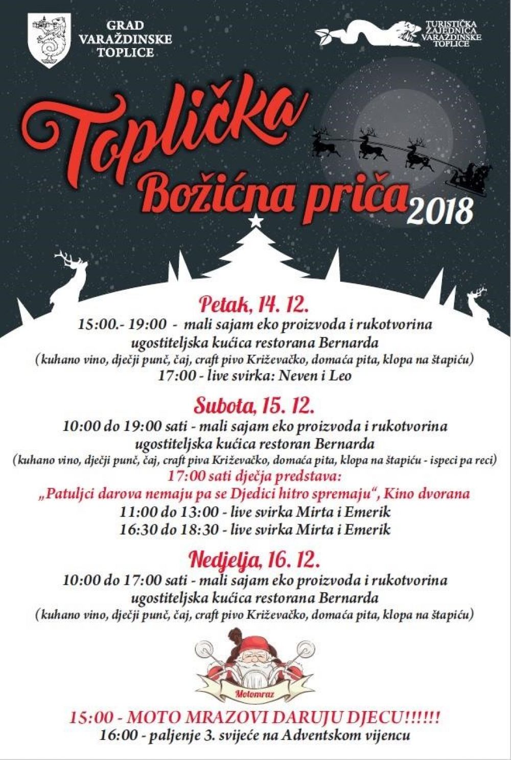 Od petka 14. do nedjelje 16. prosinca središnjim trgom Varaždinskih Toplica širit će se miris kuhanog vina, punčeva i toplih napitaka. Bit će i žive svirke, sajam rukotvorina, moto mrazevi i sjajna atmosfera predbožićnog druženja u najstarojoj hrvatskoj termalnoj rivijeri. Topličku Božićnu priču organizira Turistička zajednica Grada, u suradnji s Gradom. Za svečarski ugođaj i tople napitke pobrinuo se restoran Bernarda, koji posjetiteljima nudi i veliki izbor slastica i gastronomskih delicija u samom restoranu, koji se nalazi u dvorištu hotela i nudi mnoštvo specijaliteta od namirnica iz domaćeg vrta i biodinamičkog uzgoja.