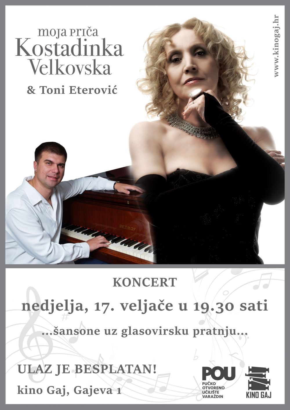 Pučko otvoreno učilište u Varaždinu organizira besplatan Valentinovski koncert Kostadinke Velkovske uz klavirsku pratnju Tonija Eterovića pod nazivom 'Moja priča'.Koncert će se održati u nedjelju, 17. veljače 2019. godine s početkom u 19:30 sati u dvorani kina Gaj u Varaždinu, Gajeva 1. Program će biti sastavljen od šansona poznate zagrebačke škole šansona autora poput Arsena Dedića (Moderato cantabile, Odlazak, Kuća za ptice), Zvonimira Goloba (Dušo moja),te autorskih pjesama Voje Šiljka i Tonija Eterovića (Nedostaje mi, Ne daj se Kosta) i druge. Drugi dio koncerta je posvećen tradicionalnim pjesmama Hrvatske i Makedonije.