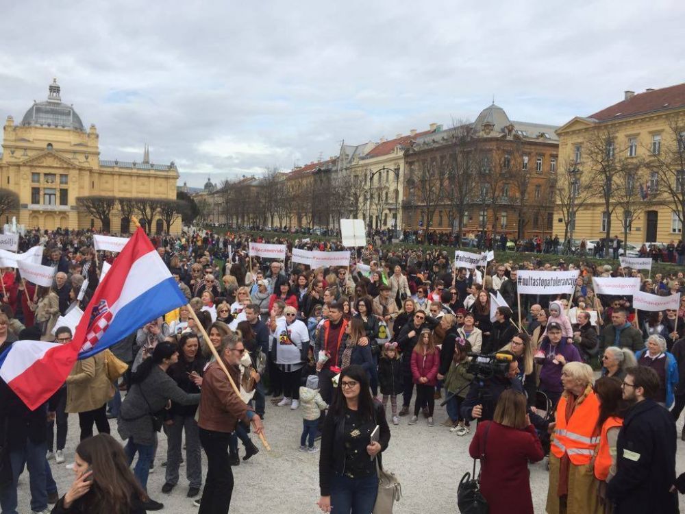 Na Trgu kralja Tomislava okupilo se više stotina prosvjednika, od kojih mnogi nose transparente s natpisima "Ljubav ne boli", "Nasilje nije obiteljska stvar", "Nemojmo popuštati", "Svi smo odgovorni", "Zločin, a ne prekšaj", "Nulta stopa tolerancije", "I ja sam žrtva nasilja", "Žrtva nikad nije kriva", "Hrabri ljudi", "Djela, a ne riječ". Prosvjed je organiziran nakon što je početkom ožujka glumica i scenaristica Jelena Veljača na Facebooku otvorila grupu nazvanu #Spasime, koja je do sada okupila više od 48.000 ljudi. Veljača je putem društvene mreže pozvala građane na prosvjed za sve one koji nisu spašeni od nasilja u obitelji, a prosvjed i grupa potaknuti su zločinom na Pagu, gdje je otac s balkona bacio svoje četvero djece. Jedan od zahtjeva prosvjednika jest da se nasilje u obitelji vodi kao kazneno djelo, a ne prekršaj. Osim u Zagrebu, prosvjed se istodobno održao i u drugim gradovima.