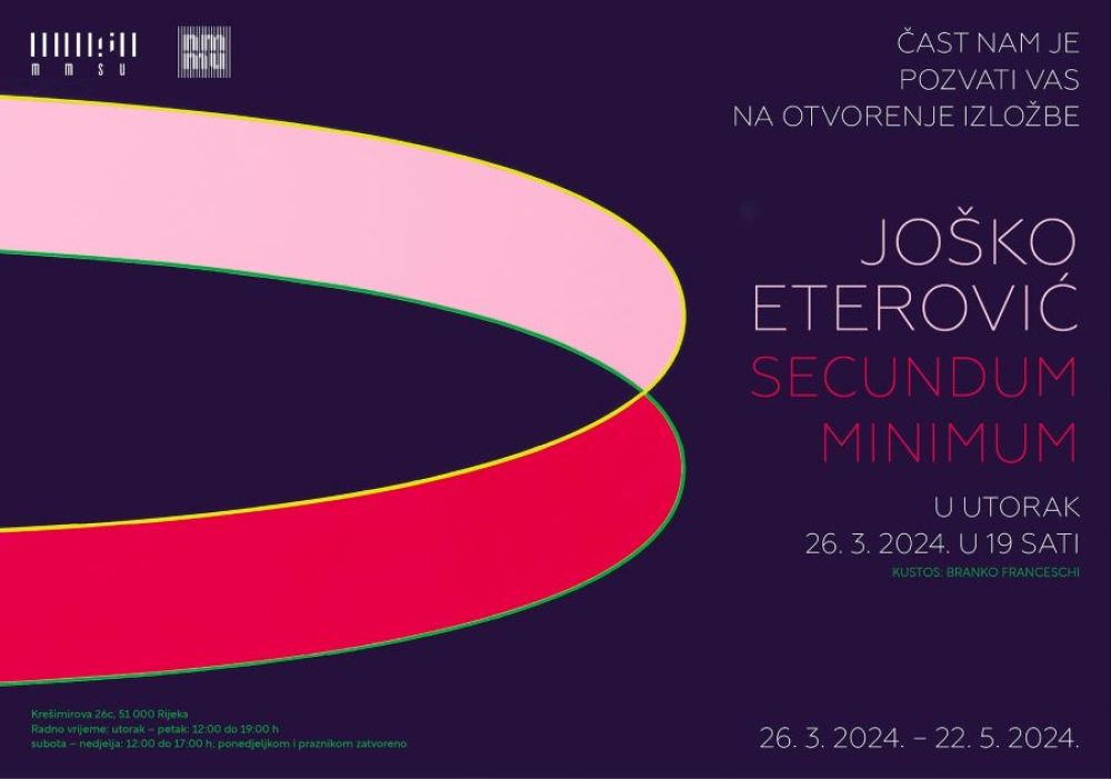 Nakon gotovo dvadeset godina i izložbe Od Prekinute linije do Mutacija 1970. – 2006., Joško Eterović se vraća u MMSU izložbom Secundum minimum, koja će premijerno predstaviti novi istoimeni ciklus Eterovićevih slika nastalih između 2019. i 2024. godine. Secundum minimum označava Eterovićev povratak estetici minimalizma i optičke umjetnosti pa uz recentne slike, a u svrhu njihove kontekstualizacije u njegovom bogatom opusu, izložba u uvodnom dijelu postava predstavlja i radove kojima je periodično iskazivao inklinaciju reduktivnom stvaralačkom principu. Kompozicije su fokusirane na interakciju elementarnih geometrijskih oblika poput krugova ili elipsi i dinamizirane sofisticiranim međutonovima komplementarnih boja. Slikarski koncept naglašava utjecaj i nasljeđe optičke umjetnosti sveden na minimalističku interakciju tri elementa: boju, liniju i oblik. Preciznost i jasnoća kojom odišu novi radovi, a koje se zasnivaju u izvedbi bojanih polja, međuodnosu formi i tenziji optičke igre, ukazuju na dugotrajnu, kontinuiranu i posve autentičnu umjetničku znatiželju i dosljednost umjetničkog istraživanja onkraj neprekidne izmjene dominantnih likovnih tendencija u pedeset godina tijekom kojih se razvija stvaralaštvo Joška Eterovića. U eri dominacije digitalnih medija u vizualnoj kulturi, a slikarstva figuracije u likovnosti, svježina postminimalističkih i neogeometrijskih konstelacija Joška Eterovića, predstavlja novi uzlet i reafirmira značenje neokonstruktivizma u suvremenoj umjetnosti i kulturi.