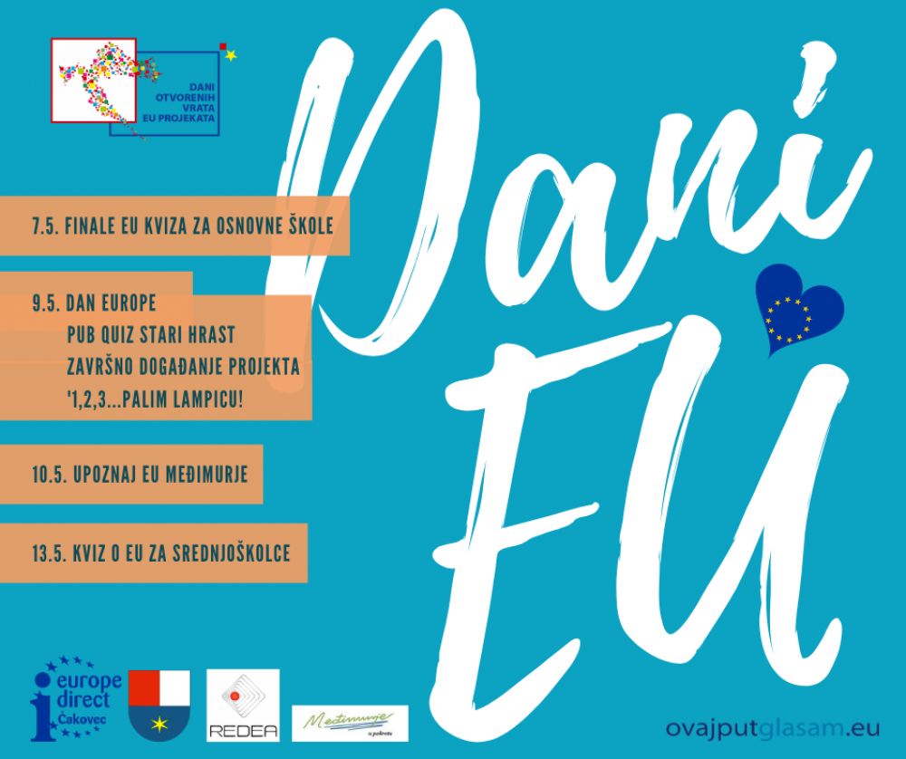 Međimurska županija i Informacijski centar EUROPE DIRECT Čakovec i ove su godine pripremili zanimljiv program za Dane Europe koji se održavaju od 7. do 16. svibnja.Obilježavanje započinje finalnim natjecanjem EU kviza za sedme razrede koje će se održati u utorak, 7. svibnja u II. osnovnoj školi Čakovec. Ovo je već tradicionalno sedamnaesto izdanje EU kviza te su mnoge generacije o Europskoj uniji prvi puta učile pripremajući se upravo za ovo natjecanje. Kviz se provodi u dva kruga, kvalifikacijski krug, koji se održao sredinom travnja te su u njemu imale mogućnost sudjelovati sve osnovne škole, dok je u finalni krug ušlo 6 najboljih timova.