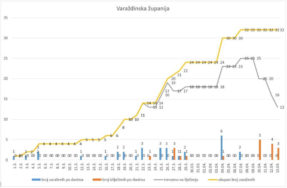 U posljednja 24 sata u Varaždinskoj županiji nema novooboljelih od koronavirusa, a ozdravilo je njih troje.Time je ukupan broj do sada oboljelih i dalje 32, a ozdravilo je ukupno 19 osoba. Na liječenju u Općoj bolnici Varaždin nalazi se 12 osoba i dobrog su općeg stanja, dok se jedna osoba nalazi na respiratoru u Klinici za infektivne bolesti „Dr. Fran Mihaljević“ u Zagrebu. Statistički se Varaždinskoj županiji i dalje pribrajaju dodatne 3 osobe koje ovdje imaju prijavljeno mjesto prebivališta, ali žive u Zagrebu, gdje su i testirani i tamo se liječe.