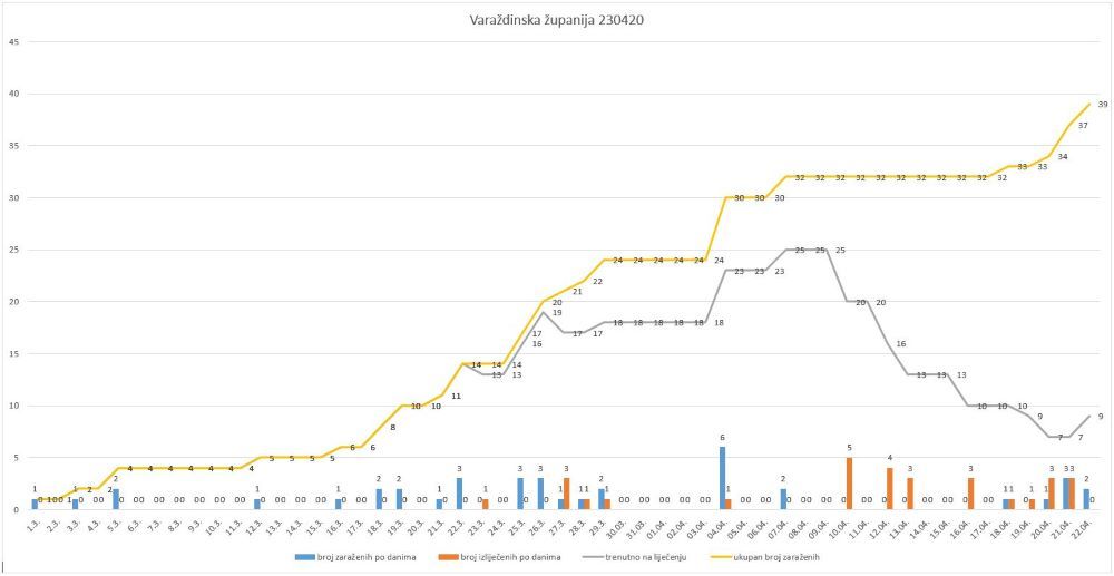 U posljednja 24 sata u Varaždinskoj županiji imamo potvrđena dva nova slučaja zaraze koronavirusom. Ukupan broj do sada oboljelih time je narastao na 39. Ozdravilo je ukupno 30 osoba. Od devet trenutno bolesnih, dvije osobe nalaze se na liječenju u Klinici za infektivne bolesti u Zagrebu. Kod posljednjih novooboljelih radi se o starijem bračnom paru, koji nije u nikakvoj vezi s prethodno zaraženima i nije bio pod mjerom samoizolacije. U postupku je intenzivna epidemiološka obrada kontakata, tako da će se sutra moći izvijestiti nešto više o tome. Trenutno su dobrog općeg stanja. U mjeri samoizolacije se na današnji nalazi 1065 osoba, čime se Varaždinska županija i dalje nalazi u samom vrhu u Republici Hrvatskoj.