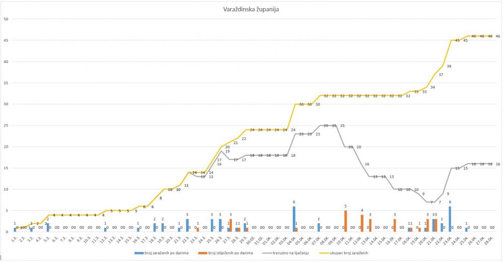 U Varaždinskoj županiji, 29. travnja do 12.30 sati priopćeno je da u posljednja 24 sata nije evidentiran niti jedan novi slučaj zaraze koronavirusom pa su tako ukupne brojke ostale nepromijenjene. Oboljelo je ukupno 46 osoba, a ozdravilo njih 30. Na liječenju u Općoj bolnici Varaždin i dalje se nalazi 13 osoba, a u Klinici za infektivne bolesti „Dr. Fran Mihaljević“ u Zagreb trenutno se liječe tri osobe s našeg područja. Statistički se Varaždinskoj županiji pribrajaju još 4 osobe koje ovdje imaju samo prijavljeno mjesto prebivališta.