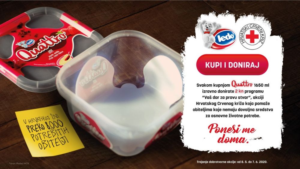 Sva tako prikupljena sredstva od prodaje Quattro sladoleda, Ledo će darovati Crvenom križu koji će ih, u sklopu svoje humanitarne akcije „Vaš dar za pravu stvar“, namijeniti osiguranju toplog obroka i osnovnih prehrambenih namirnica za najpotrebitije članove zajednice.