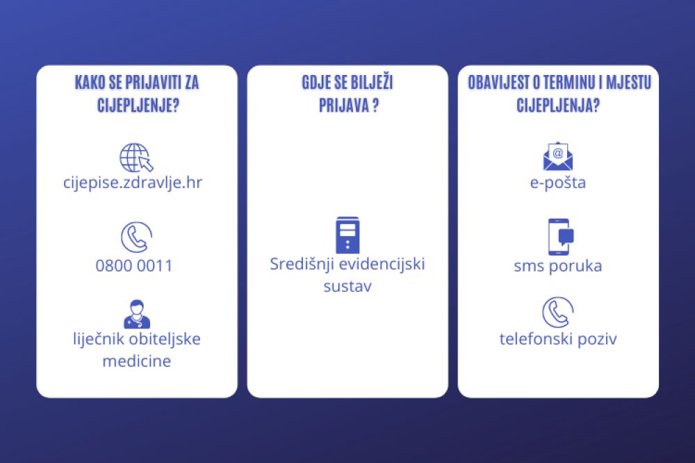 Od ponedjeljka, 1. ožujka 2021., svi hrvatski državljani i osobe s prebivalištem i boravištem u Hrvatskoj mogu se prijaviti za cijepljenje preko internetske stranice cijepise.zdravlje.hr, ili telefonom na 0800 0011 gdje će njihove prijave biti zaprimljene i zabilježene u središnjem evidencijskom sustavu. Kao i dosad, građanima s kroničnim bolestima preporučujemo da se najprije prijave preko svojih liječnika obiteljske medicine, koji će potvrditi njihovo zdravstveno stanje i odrediti prioritetno mjesto na listi cijepljenja. Nepokretne ili teže pokretne osobe također se prijavljuju za cijepljenje svom liječniku obiteljske medicine koji će organizirati cijepljenje prilikom kućnog posjeta ili pomoću mobilnih timova, dok će za osobe smještene kod pružatelja usluge smještaja ili u specijalnim bolnicama cijepljenje biti organizirano u tim ustanovama kao i do sada.