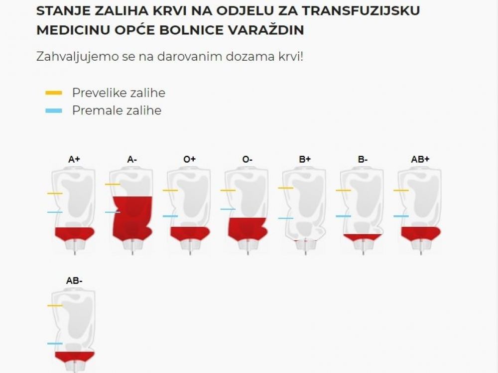 Poziv dragovoljnim darivateljma krvi - Zbog smanjenih zaliha krvi na Odjelu za transfuzijsku medicinu Opće bolnice Varaždin, pozivaju se darivatelji svih krvnih grupa da se odazovu na darivanje krvi. Zahvaljujemo Vam za svaku darovanu dozu u ime primatelja kojima pomažete u ozdravljenju.