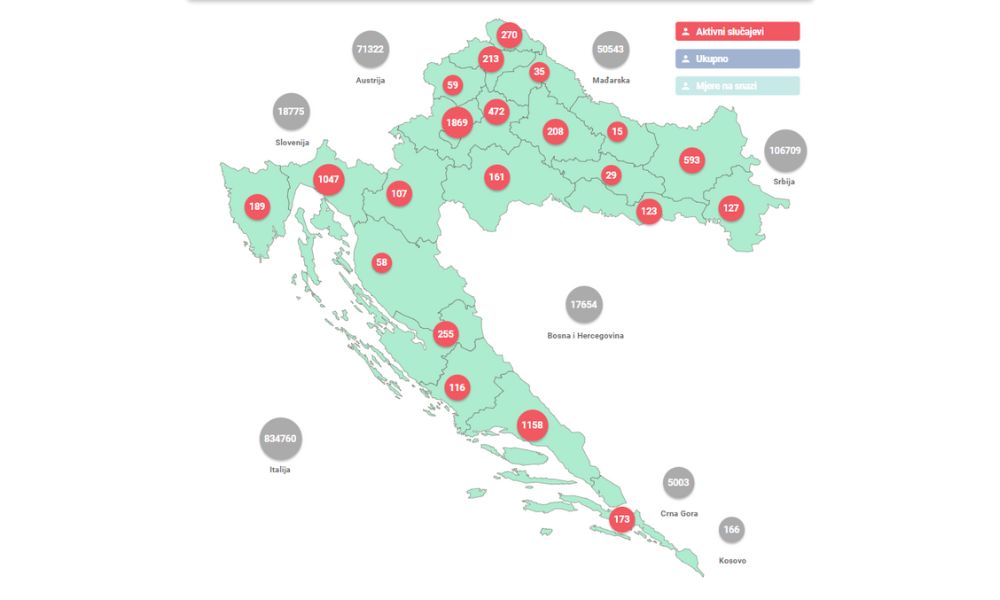 U posljednja 24 sata zabilježeno je 1.874 novih slučajeva zaraze virusom SARS-CoV-2 te je broj aktivnih slučajeva u Hrvatskoj danas ukupno 7.277.