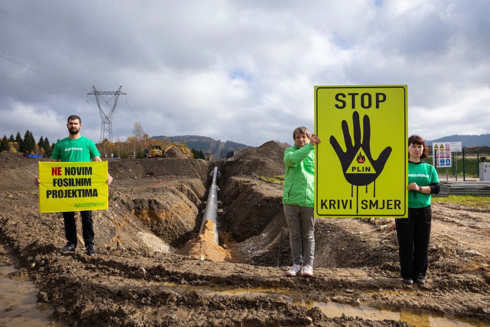 Priopćenje Greenpeacea - Aktivisti Greenpeacea na trasi plinovoda Zlobin-Bosiljevo transparentima ‘Krivi smjer’ i ‘Ne novim fosilnim projektima’ poručili su Europskoj uniji i njenim državama članicama da zaustave sva ulaganja u nove fosilne projekte dok još nije prekasno, kako bi se globalno zagrijavanje zadržalo unutar 1,5°C. Ovom simboličnom akcijom Greenpeace je predstavio otvoreno pismo koje je do sada potpisalo više od 70 tisuća građana diljem EU, a potpise hrvatskih građana Greenpeace će priključiti europskoj inicijativi i zahtjevima Europskoj uniji za sigurnu i pravednu budućnost.