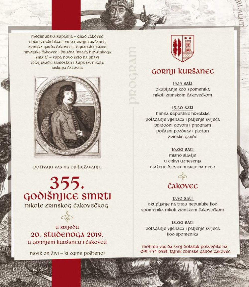 U srijedu, 20. studenog u Gornjem Kuršancu (kod spomenika Nikoli Zrinskom), s početkom u 15:30 sati, bit će održano obilježavanje 355. godišnjice pogibije Nikole Zrinskog Čakovečkog. Obilježavanje će se održati prema sljedećem protokolu: