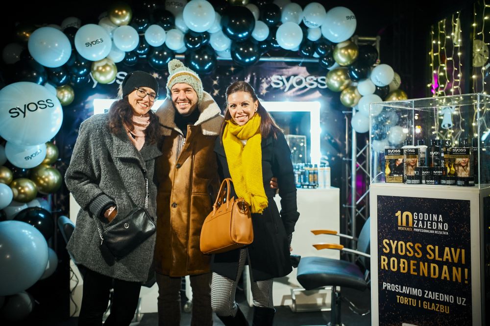 Dinamičan i nadasve originalan rođendanski party u nešto više od tri sata okupio je oko tri tisuće znatiželjnika koji su zajedno s hrvatskim SYOSS timom "zafeštal"i uz raznovrsne sadržaje. Subotnjim eventom u sklopu adventskog Ledenog parka, Syoss, jedan od najznačajnijih kozmetičkih brandova za kosu, proslavio je svojih prvih i uspješnih 10 godina u Hrvatskoj.Proslava je započela laganim zagrijavanjem uz zvuk adventskih pjesama u 17,30 sati, a brojni zainteresirani građani su stali u red u Syoss beauty corner u kojem su imali priliku isprobati vrhunske SYOSS proizvode za kosu te na dar dobiti i prigodnu frizuru iz ruku SYOSS frizerskih majstora. Središnji dio rođendanske proslave započeo je u 18 sati, uz obraćanje Anite Penić Knep, marketing direktorice pri odjelu Adria Region Henkel Beauty Care, a svečanom otvorenju pridružili su se i Ana Cicvarić i Saša Kanazir, SYOSS brand manageri.