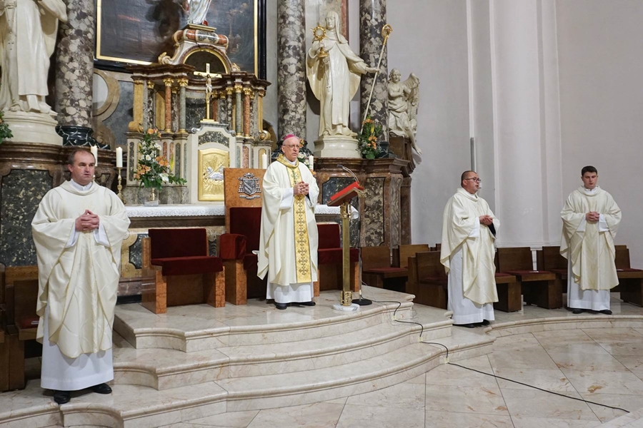 Biskup je na početku slavlja kazao okupljenima kako se današnje nedjelje diljem Požeške biskupije na misama molitvenim srcem prisjećamo stote obljetnice rođenja utemeljitelja Požeške biskupije. Pozvao ih je da se u tom činu sjedine s ostalim vjernicima te iskažu zahvalnost Bogu za dar života Ivana Pavla II., za njegovu dobrotu, utjehu i ohrabrenje koje nam je iskazivao tijekom Domovinskog rata, za priznanje Hrvatske neovisnom državom, tri pastoralna pohoda našoj domovini, a napose za osnutak Požeške biskupije. Potaknuo ih je da o 75. obljetnici završetka Drugog svjetskog rata upute Bogu molitvu za sve nedužne žrtve, napose bleiburškog križnog puta.