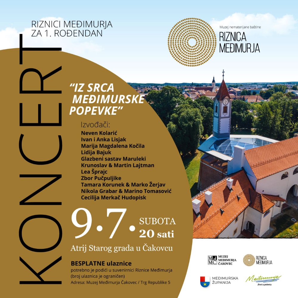 Prošlo je točno godinu dana od otvorenja Muzeja nematerijalne baštine, Riznice Međimurja, bisera kontinentalne Hrvatske kojim je očuvana međimurska kulturna baština i tradicija kroz projekt vrijedan 45 milijuna kuna, a tim povodom u subotu, 9. srpnja održat će se koncert „Iz srca međimurske popevke – koncert Riznici Međimurja za 1. rođendan“.