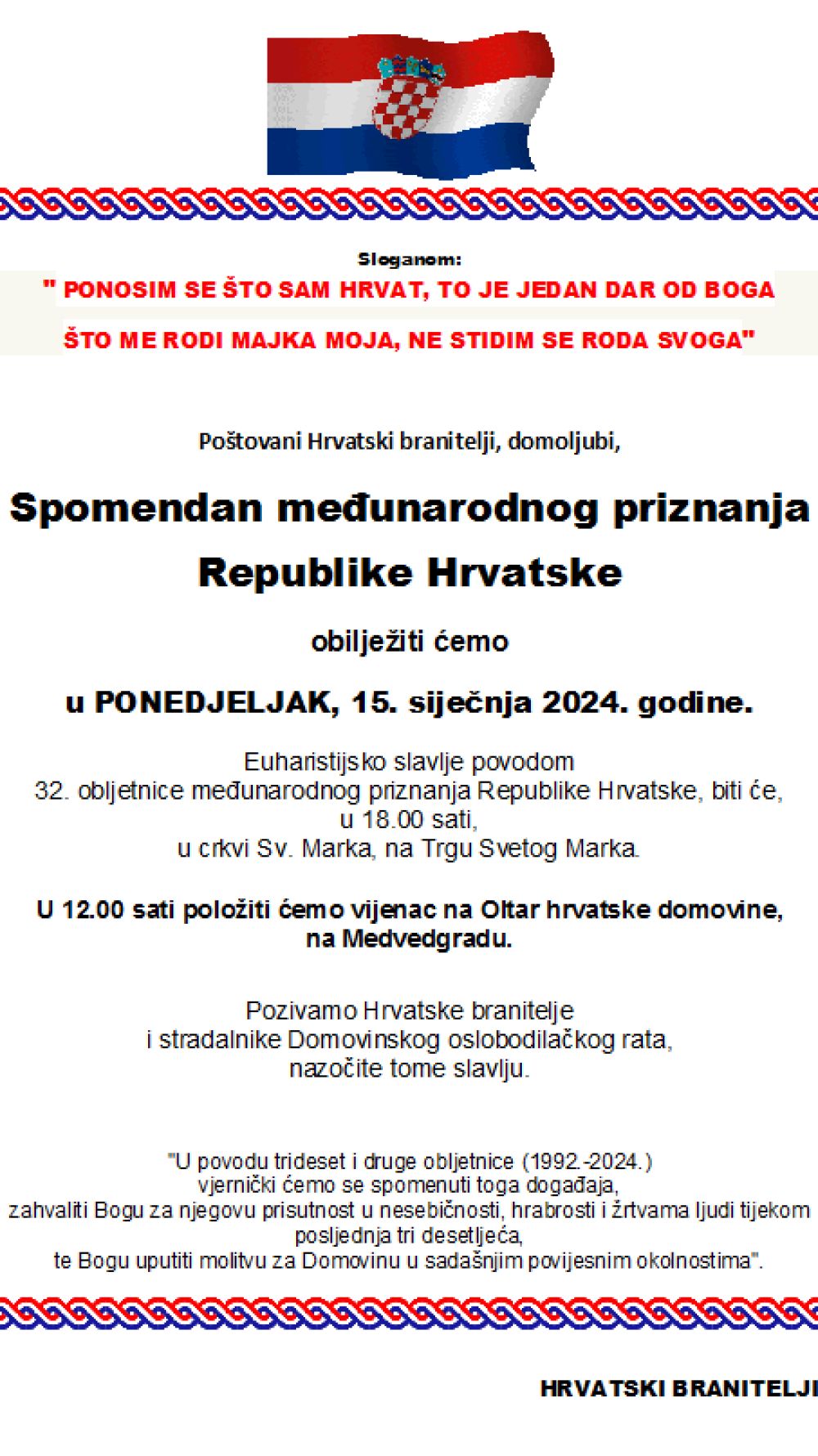 "Današnji dan - 15. siječnja 1992. - bit će zlatnim slovima uklesan u cijelu, četrnaest stoljetnu, povijest hrvatskog naroda na ovome prostoru, za nas svetom tlu između Mure, Drave, Dunava i Jadrana. Nakon što je proglasila svoju samostalnost i suverenost, i raskinula svoje državno-pravne veze s bivšom jugoslavenskom državnom zajednicom, Republika Hrvatska postigla je i međunarodno priznanje svoje neovisnosti"