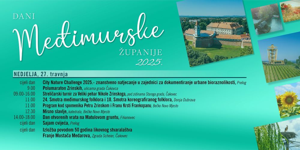 Dani Međimurske županije - događanja 27. travnja - u sklopu programa Dana Međimurske županije 2025., koji se održava od 21. travnja do 11. svibnja, podsjećamo na događanja u nedjelju, 27. travnja: