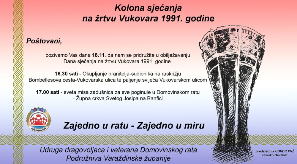 U utorak, 18. studenoga 2025. godine, Udruga dragovoljaca i veterana Domovinskog rata Podružnica Varaždinske županije, u suradnji s Gradom Varaždinom, paljenjem svijeća i svetom misom obilježit će žrtvu Vukovara prema rasporedu: