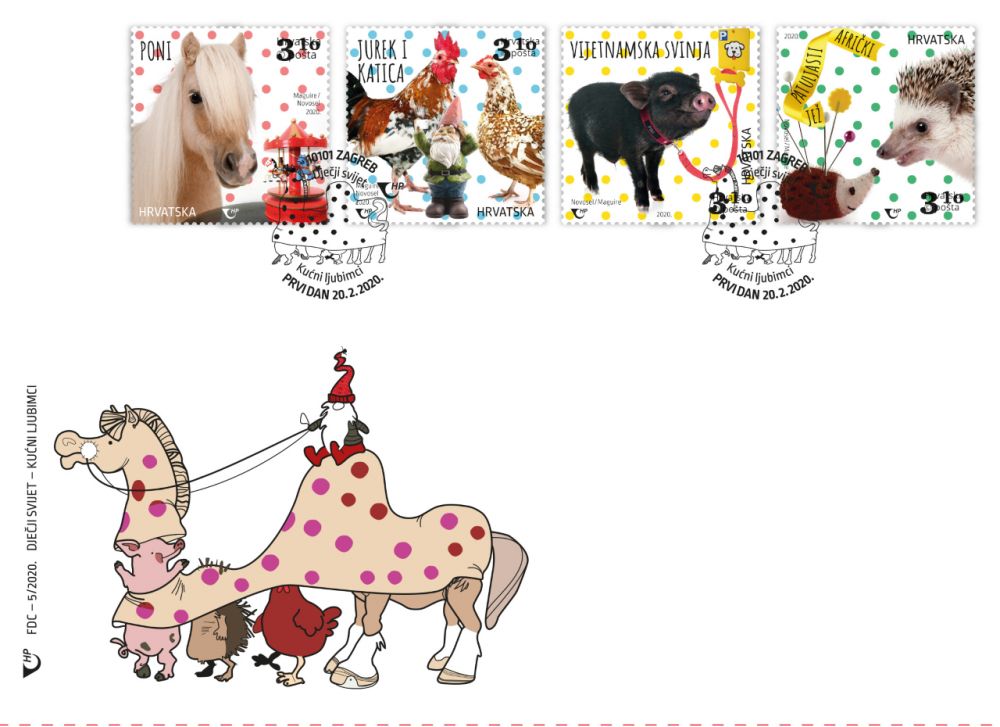 Hrvatska pošta pustit će u optjecaj 20. veljače nove redovite poštanske marke iz serije Dječji svijet – patuljaste životinje. Motivi prikazani na poštanskim markama su afrički patuljasti jež,hrvatska patuljasta kokoš, poni i vijetnamska svinja, a autori dizajna maraka suLidija Novosel i Adam Peter Maguire. Marke su izdane u zajedničkomarčiću od 8 maraka, a Hrvatska pošta izdala je i prigodnu omotnicu prvog dana (FDC). Nominalna vrijednost izdanih marka je 3,10 kn, a tiskane su u nakladi od 100000 primjeraka po motivu.