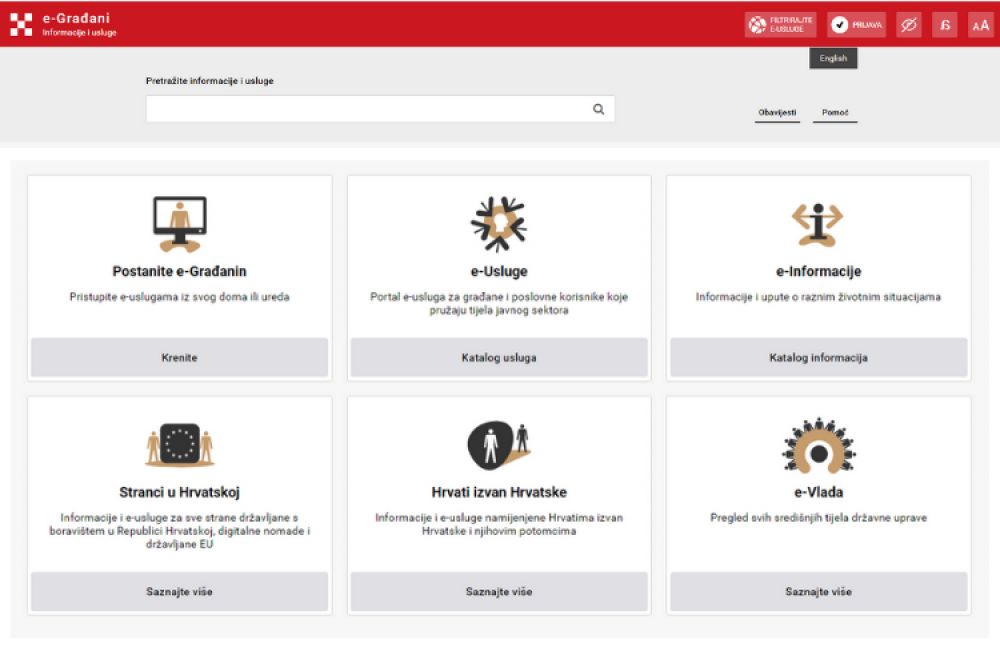 5. Prepoznatljiva crvena navigacijska traka koja prolazi kroz sve usluge gdje god se nalazili u sustavu. Traka sadrži korisnički profil, filtar usluge, korisnički pretinac, promjenu entiteta koji korisnik predstavlja (e - autorizacije) i omogućuje postavke pristupačnosti.