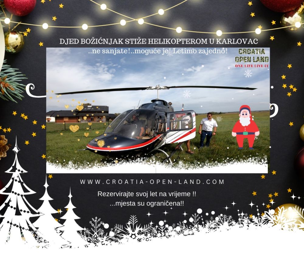 Croatia Open Land Tours DMC za sve željne adrenalina nudi nezaboravni doživljaj jedinstven u Hrvatskoj panoramski let helikopterom iznad Karlovca u društvu Djeda Božićnjaka! Event je podržao grad Karlovac i dao suglasnost za slijetanje - te uključio ovaj događaj kao jedinstvenu ponuda u sklopu Adventa u Karlovcu!