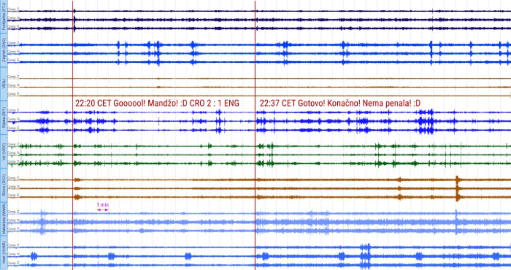 Seizmologinje dr. sc. Marija Mustać iz Seizmološke službe Hrvatske i dr. sc. Iva Dasović s Geofizičkog zavoda jutros su provjeravale zapise seizmografa diljem Hrvatske i uočile neke zanimljive signale, objavio je HRT.Seizmološke postaje Geofizičkog odsjeka Prirodoslovno-matematičkog fakulteta Sveučilišta u Zagrebu sinoć su zabilježile pojačano podrhtvanje tla s početkom u 22:20 CET i 22:37 CET – odmah nakon što je Mario Mandžukić postigao gol za vodstvo hrvatske reprezentacije, odnosno nakon što je sudac Cakir oglasio kraj utakmice kojom se Hrvatska plasirala u finale Svjetskog prvenstva!