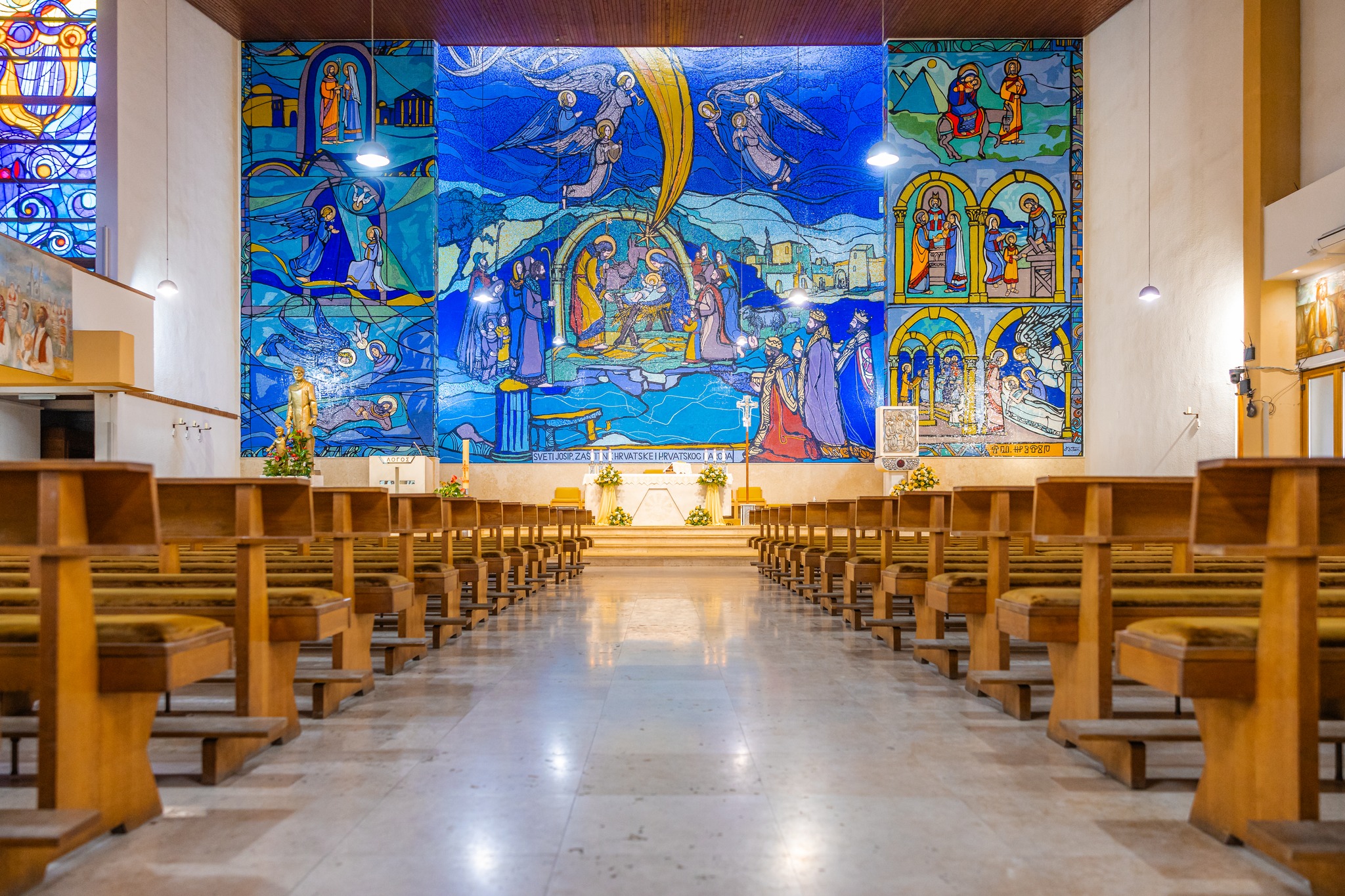Podsjetimo se, da je u jesen 2021.godine otvoren prvi dio mozaika, kojemu je autor namijenio naziv Sveta noć i sada se završetkom umjetničkoga djela o Svetom Josipu u svojoj cjelovitosti posvećuje Svetoj obitelji i Svetom Josipu zaštitniku Hrvatske i hrvatskoga naroda, te zaštitniku grada Karlovca i Karlovačke županije. Prvi dio mozaika (već tada najveći mozaik hrvatski crkve) postavljen je na površinu od 120m2 u 168 ploha. Sadašnji cjeloviti mozaik postavljen je u prezbiteriju na 200 metara četvornih u 264 plohe i ukupno na 700.000 staklenih pločica industrijskog i murano stakla.