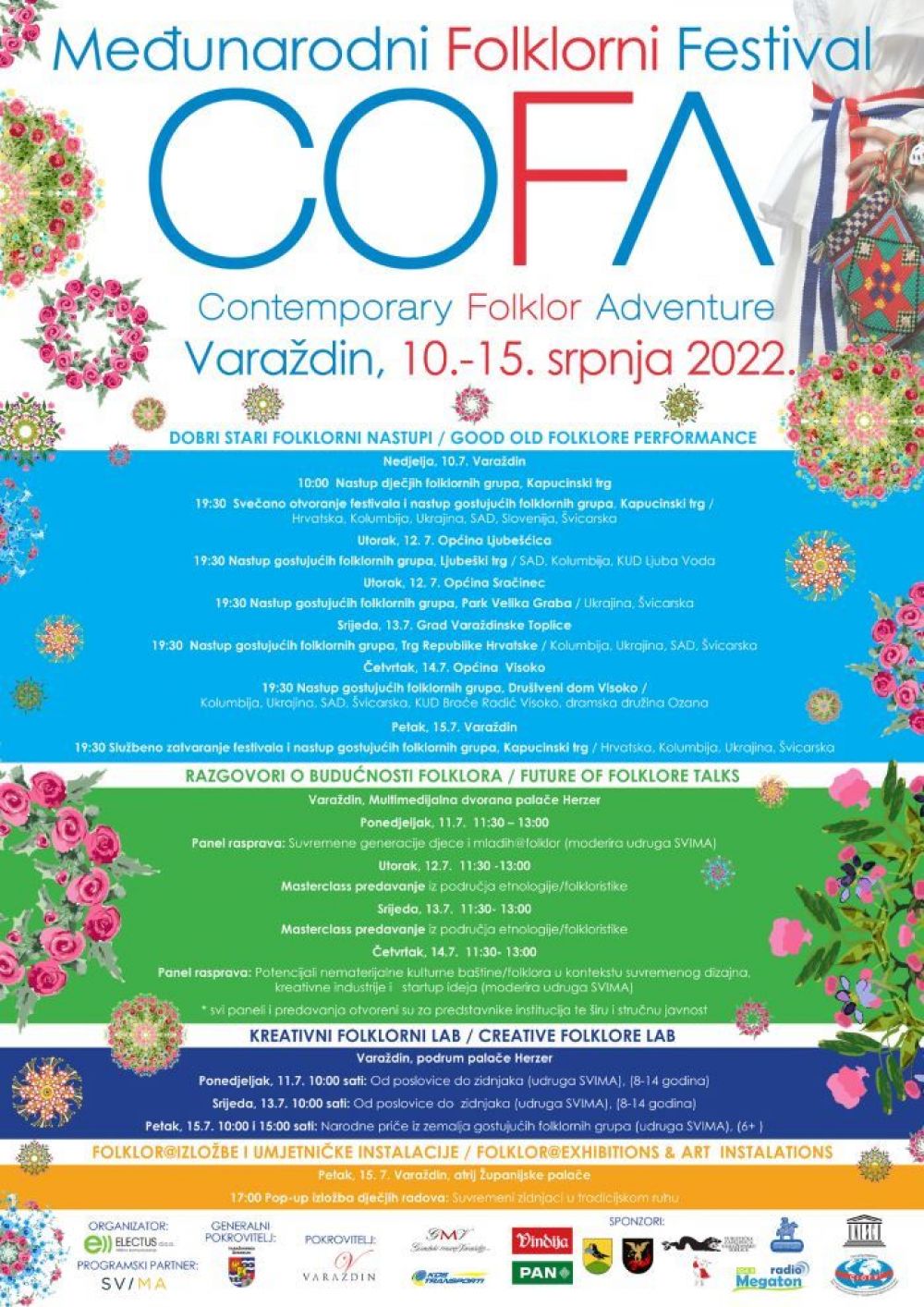 -Doista smo se potrudili da u našu županiju dovedemo najbolje certificirane folklorne skupine iz cijelog svijeta. Tako će se po prvi puta predstaviti folkloraši iz Kolumbije i Amerike. Od naših predstavnika nastupit će Varaždinski folklorni ansambl. Nismo zaboravili ni na naše najmlađe članove folklorno-umjetničkih društava. Ujedno za najmlađe žitelje Varaždina bit će organizirane edukativne radionice i čitaonice u jutarnjim satima u palači Herzer, a jedna od atrakcija bit će i umjetnička instalacija koja će krasiti pročelje Županijske palače – najavila je Petra Golubar i podsjetila kako je COFA prvi varaždinski certificirani međunarodni folklorni festival, koji je svoju oznaku kvalitete stekao članstvom u međunarodnoj krovnoj organizaciji CIOFF, u partnerstvu s UNESCO-om. Riječ je o međunarodnoj organizaciji koja se bavi folklornim festivalima i očuvanju kulturne baštine te okuplja preko 130 članica iz cijelog svijeta.
