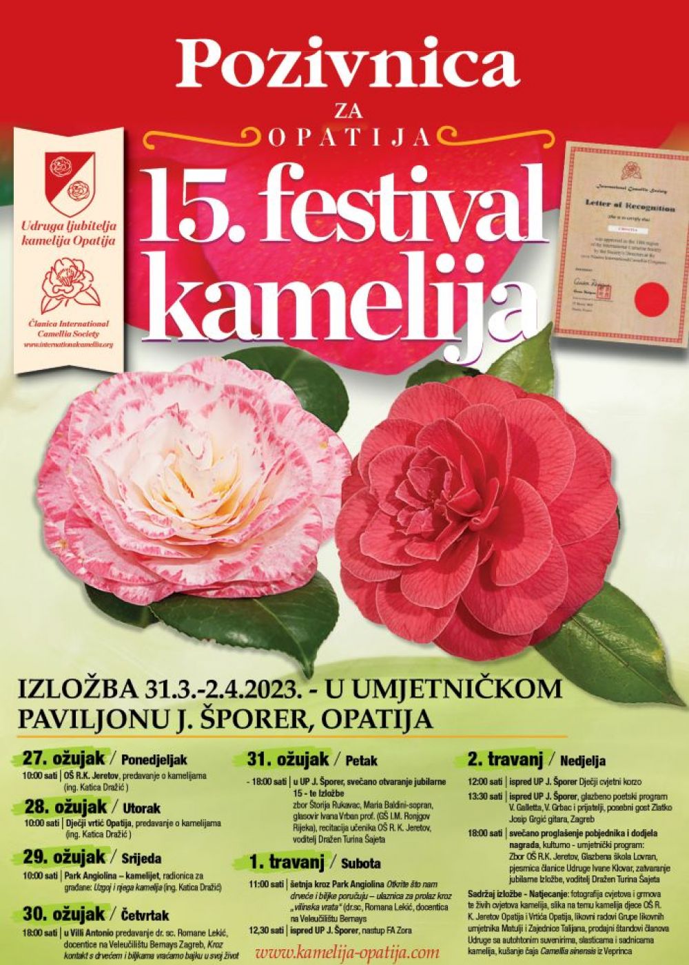 Također organizatori i ove godine poseban naglasak stavljaju na radionicu za građane na temu: Uzgoj i njega kamelija, koja je održana u srijedu, 29. ožujka, u Parku Angiolina, te predavanje dr. sc. Romane Lekić, docentice na Veleučilištu Bernays Zagreb. - Kroz kontakt s drvećem i biljkama vraćamo bajku u svoj život u 18 sati u Villi Antonio u četvrtak 31. ožujka dok je već tradicionalno otvaranje Izložbe najljepših kamelija na rasporedu u petak 31. ožujka, u 18 sati, u Umjetničkom paviljonu Juraja Šporera.