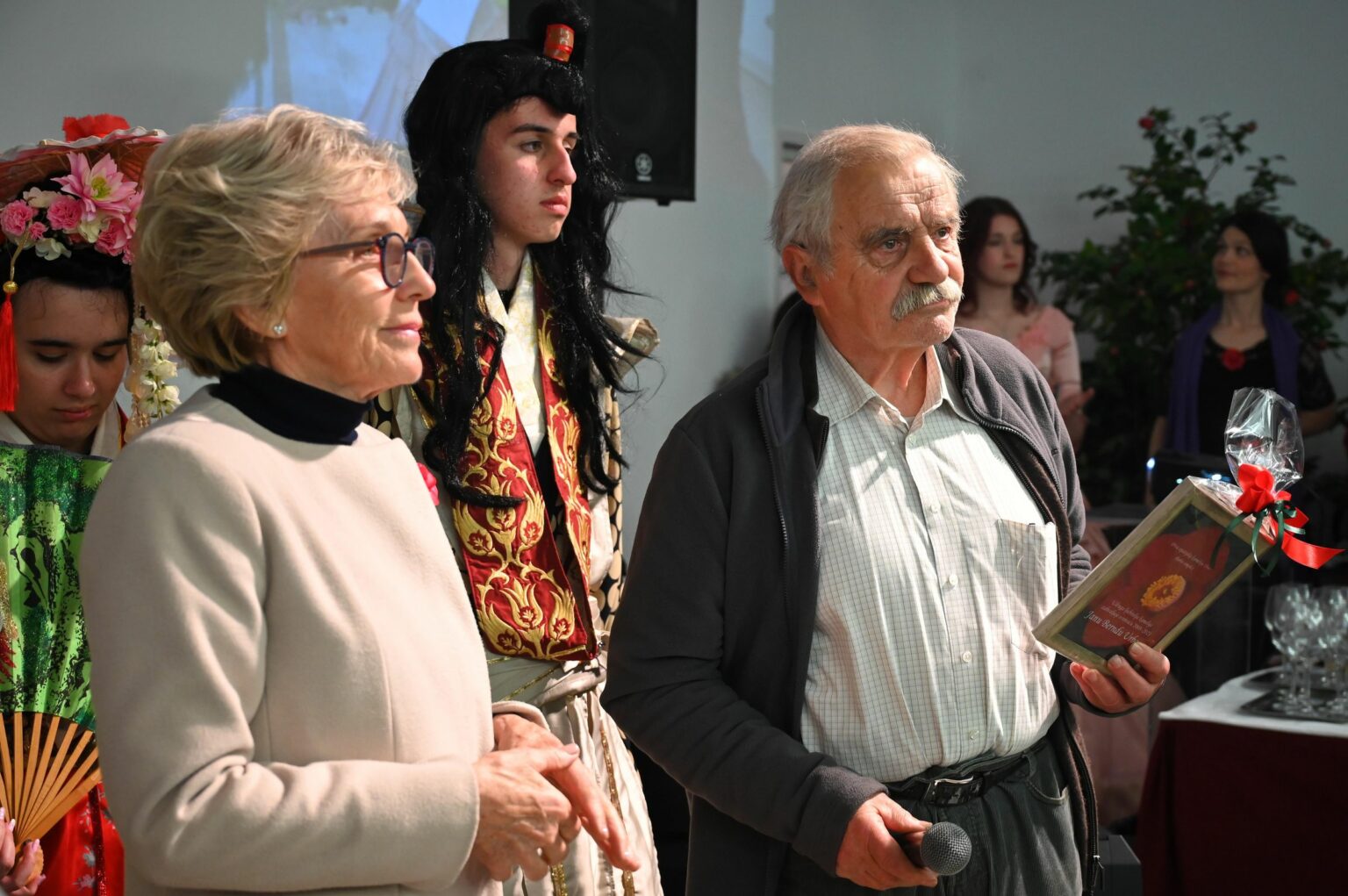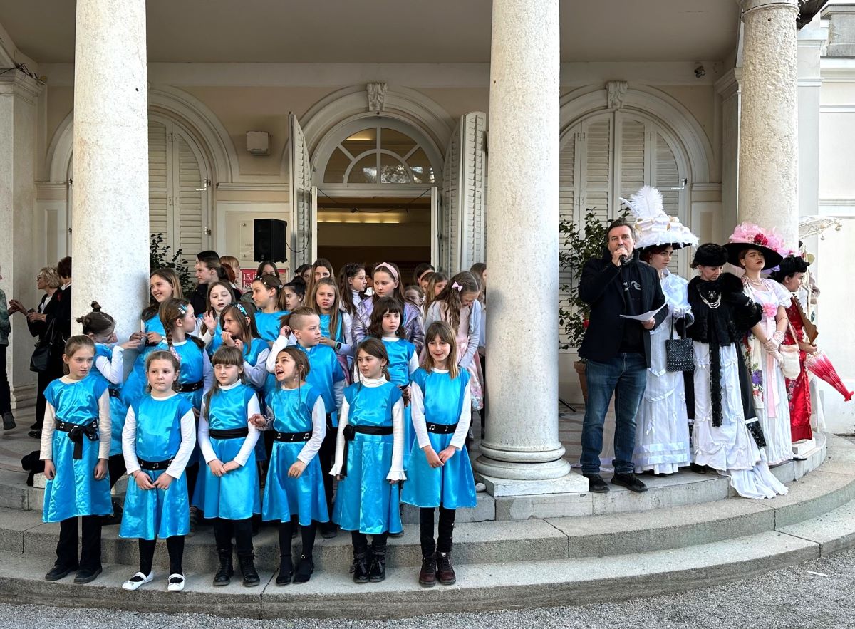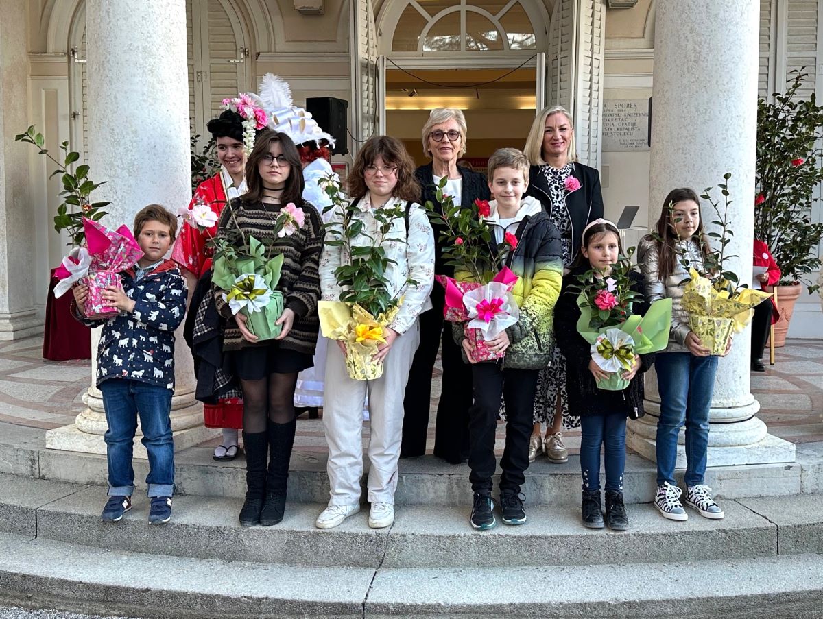 - Imam lijepu haljinu danas, ali vi ste djeco još puno ljepše odjeveni, zaista ste prekrasni. Znate li da su cvjetovi koje imate na svojim šeširićima kamelije, opatijski simbol? A iza vaših leđa rastu i cvjetaju i prave kamelije, nježni cvjetovi kojih ovdje njegujemo i organiziramo festival u njihovu čast. Kamelije su inače došle u Europu iz daleke Kine, nekada davno, a u Park Angiolinu u Opatiji, u 19. stoljeću.