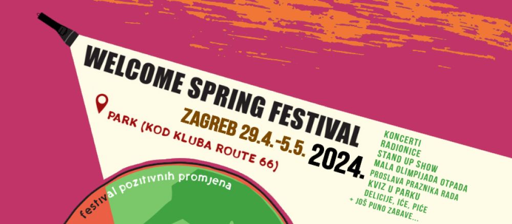 Umjetnost, ples i održivost samo su dio 6. izdanja Welcome Spring Festivala koji otvara sezonu festivala u Zagrebu u ponedjeljak, 29. travnja. Ovogodišnji festival donosi obilje interaktivnih radionica, zanimljivih predavanja, olimpijada i glazbenih nastupa koji će trajati sedam dana, sve do 5. svibnja, na livadi između ulice Hrvatske bratske zajednice i Vukovarske ulice (kod kluba Route 66).