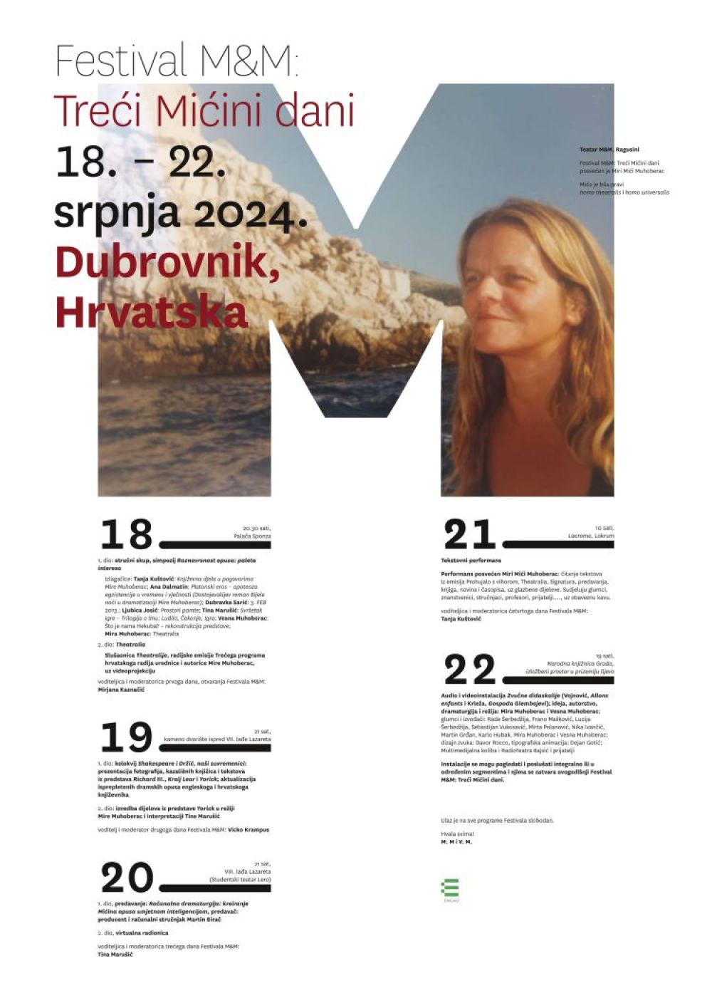 „U Dubrovniku je od 18. do 22. srpnja i u organizaciji Teatra M&M i Ragusina već treću godinu održan Festival M&M: Treći Mićini dani, posvećen Miri Mići Muhoberac koja je bila pravi homo theatralis i homo universalis, jednoj od najpoznatijih osoba hrvatske kulturne, znanstvene i umjetničke scene, dramaturginji, teatrologinji, redateljici, sveučilišnoj profesorici Filozofskoga fakulteta Sveučilišta u Zagrebu, Karlova sveučilišta u Pragu, predavačici na fakultetima u Osijeku, Puli, Zadru, književnoj i kazališnoj kritičarki, autorici i urednici knjiga, časopisa, novina i radijskih emisija u Zagrebu i Dubrovniku, novinarki, znanstvenici, predsjednici Hrvatskoga društva kazališnih kritičara i teatrologa, ravnateljici Kazališta Marina Držića, izbornici kazališnih festivala, članici i predsjednici kazališnih i književnih povjerenstava, dugogodišnjoj članici Matice hrvatske i Odjela za kazalište i film.