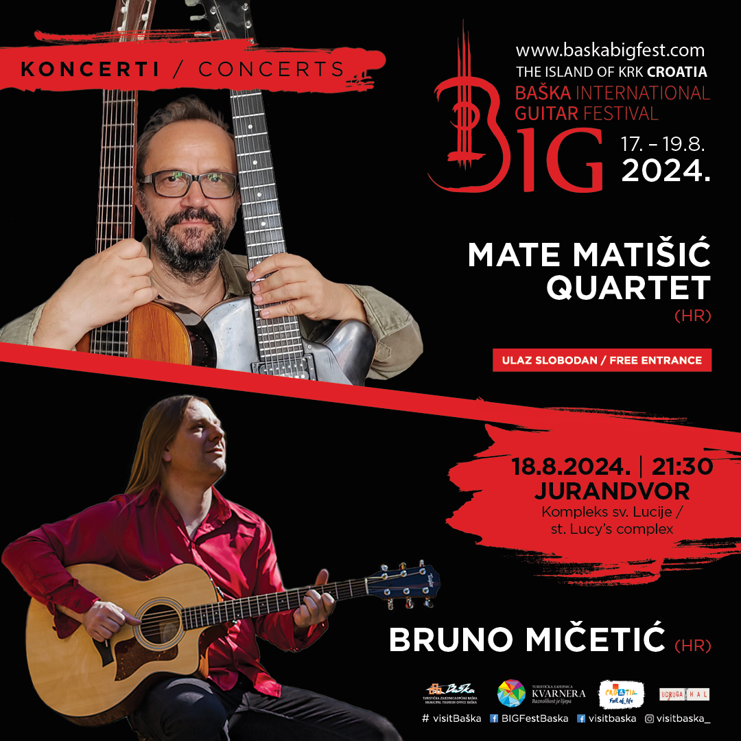 Druga večer BIG festivala posvećena je domaćim talentima. Mate Matišić, jedan od najznačajnijih hrvatskih dramskih pisaca i višestruko nagrađivani skladatelj filmske glazbe, donosi svoj jedinstveni gypsy jazz stil. Surađivao je s najvažnijim predstavnicima tog izričaja, a njegov rad prepoznat je i nagrađivan na međunarodnim festivalima. Bruno Mičetić, s diplomom na Jazz Konservatorium Klagenfurt, jedan je od najzaposlenijih i najraznolikijih hrvatskih gitarista, čiji repertoar obuhvaća sve od jazza do rocka. Na ovogodišnjem BIG festivalu predstavit će se kao solist na akustičnoj gitari.