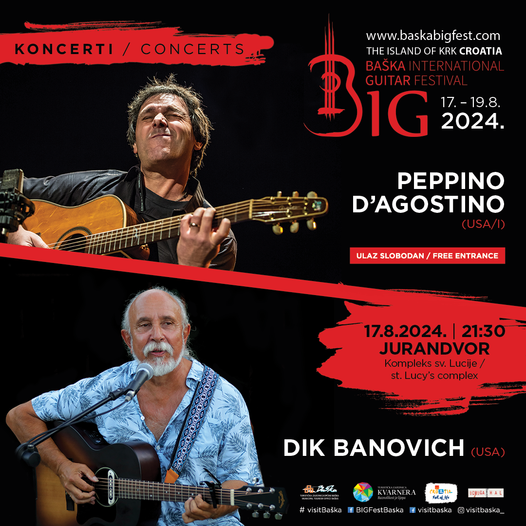 Prva večer BIG Festivala donosi uzbuđenje s nastupima nekoliko svjetski priznatih glazbenika! Peppino D’Agostino, američki gitarist talijanskih korijena, jedno je od najvećih imena suvremene akustične gitare. Svojom virtuoznošću i talentom za kompoziciju, osvojio je srca publike diljem svijeta, nastupajući u više od 35 zemalja. Osim zavidne tehnike sviranja jedan od njegovih najjačih aduta je izuzetan talent za kompoziciju pa ne čudi što čitatelji utjecajnog američkog Guitar World Magazinea jedan od njegovih albuma svrstavaju u 3 najbolja izdanja svih vremena! Dik Banovich, veteran blues scene, svojom mješavinom acoustic roots & blues glazbe osvaja publiku već 50 godina, nastupajući diljem Europe, SAD-a i Afrike. Nastupao je s nekim od najprestižnijih svjetskih imena, otvarajući nastupe zvijezdama kao što su James Brown, Peter Green i Paul Jones Band.