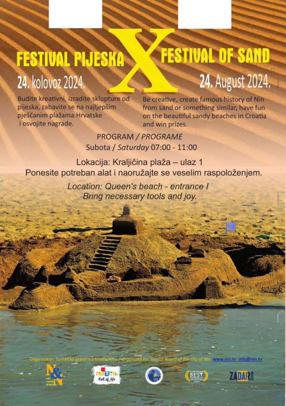 Jubilarni deseti put zaredom Turistička zajednica Grada Nina poziva vas na Festival pijeska – čarolija koja nastaje i nestaje te svim zainteresiranima poručuje: - Pridružite nam se na pješčanim plažama grada Nina u gradnji kula i skulptura od pijeska pod vodstvom umjetnika i kipara. Upravo su dvije svjetski poznate plaže - Kraljičina plaža i plaža Ždrijac, inače savršena mjesta za obitelji s malom djecom, mjesta neobičnih susreta kupača i graditelja figura i kula od pijeska.
