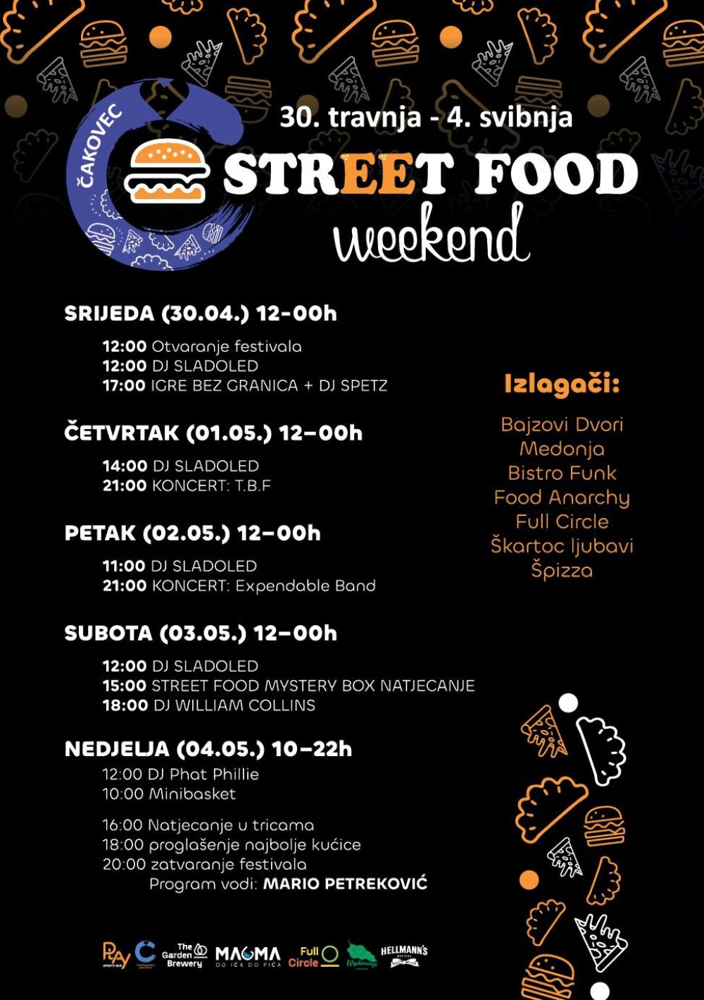 Za gladna usta pobrinut će se, za početak, domaćin festivala - Full Circle! Slijede uvijek raspoloženi Food Anarchy, neizostavni Škartoc ljubavi, međimurski omiljeni Bajzovi Dvori, varaždinski Medonja, Špizza čakovečkog juga te pobjednici proteklih izdanja festivala - Bistro Funk! O delicijama koje će pripremati nećemo puno - sve informacije dostupne su putem digitalnih kanala Street Food Weekend festivala!