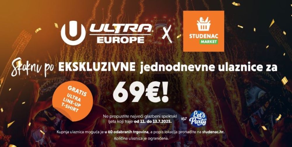 Studenac, najrasprostranjeniji trgovački lanac u Hrvatskoj, ponosni je partner ovogodišnjeg festivala ULTRA Europe koji će se održati od 11. do 13. srpnja na splitskom Parku mladeži. Zahvaljujući ovoj suradnji, od 27. lipnja u trgovinama Studenca ekskluzivno su dostupne jednodnevne ulaznice po cijeni od 69 eura za dan po izboru.