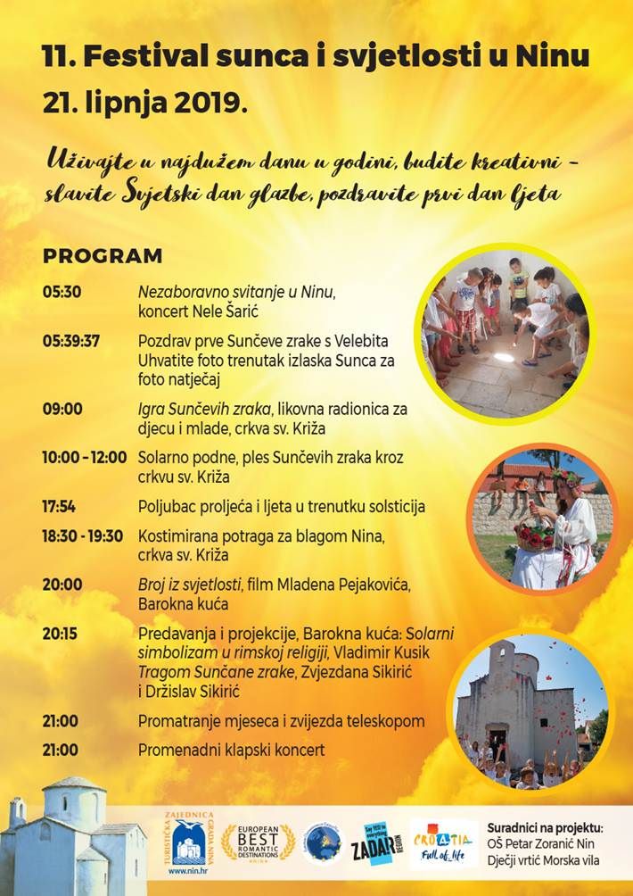 Na posljednji proljetni dan u povijesnom gradiću Ninu održat će se manifestacija pod nazivom Festival Sunca i svjetlosti. Ovaj je Festival jedinstvena prilika da izrazite svoju kreativnost i pritom doživite nešto drukčije. Naš program počinje već u 5:30 prije svitanja prve Sunčeve zrake. Za vas će koncert održati Nela Šarić, a svi zainteresirani kreativci ljubitelji fotografije moći će se odmah prijaviti na natječaj. Najmaštovitije će fotografije odnijeti vrijedne ngrade. Za najmlađe biti će organizirane radionice i potraga za blagom. U crkvici sv. Križa, simbolu grada Nina, na ovaj ćete dan imati priliku doživjeti igru Sunčevih zraka, čija je orginalna namjena još ostala djelomično nepoznata. Poljubac proljeća i ljeta dogodit će se u trenutku solsticija(17:54), a u večernjim satima moći ćete se educirati na predavanjima i uživati u romantičnoj večernjoj atmosferi uz klapu, te promatranje Mjeseca i zvijezda kroz teleskop.