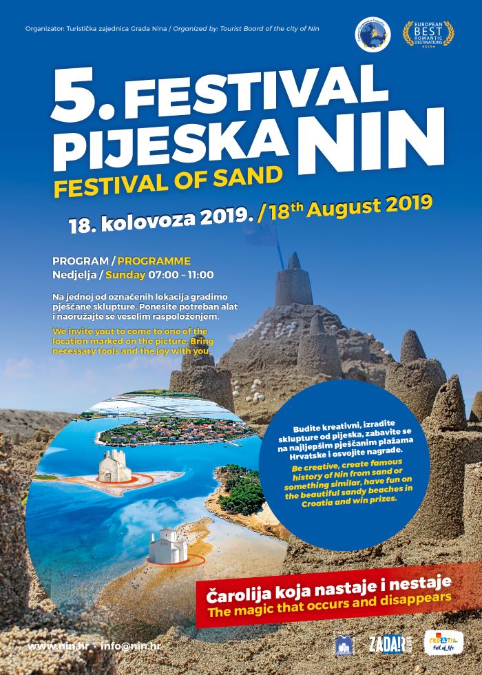 Turistička zajednica Grada Nina vas i ove godine poziva na svoj čuveni Festival pijeska gdje možete i vi graditi kule i skulpture od pijeskam, a sve pod stručnim vodstvom umjetnika i kipara. I dvije svjetski poznate Kraljičina plaža i plaža Ždrijac, inače savršena mjesta za obitelji s malom djecom, mjesta su neobičnih susreta kupača i "graditelja". Oni će svojim umijećem 18. kolovoza u ranojutarnjim satima od 7 pa do ocjenjivanja u 11 sati, stvoriti nove pješčane građevine kao rezultat njihove kreativnosti i mašte.