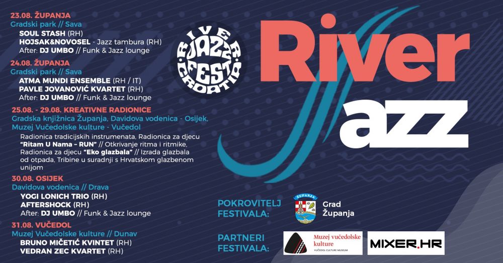 River Jazz Fest se ove godine održava u periodu od petka, 23. kolovoza do subote, 31. kolovoza, a gradovi Županja i Osijek te Muzej vučedolske kulture u blizini Vukovara, jedan od najljepših i najzanimljivijih muzeja na našem području, postat će epicentar kulturnih događanja s naglaskom na glazbene atrakcije koje nose domaći potpis. Nastavljajući tradiciju prethodnih izdanja, festival koji plovi spojit će najbolje od modernog i tradicijskog glazbenog izraza - bit će to spoj hrvatskog etna te fuzija jazza i improvizirane glazbe inspirirane tradicijama svih dijelova svijeta. Na ova glazbena putovanja posjetitelje festivala vodit će Aftershock, Yogi Lonich Trio, Atma Mundi Ensemble, Hojsak & Novosel, Soul Stash, Bruno Mičetić Kvintet, Vedran Zec Kvartet i Pavle Jovanović Kvartet, a da se večeri nastave u rasplesanom tonu funka i jazza pobrinut će se DJ Umbo.