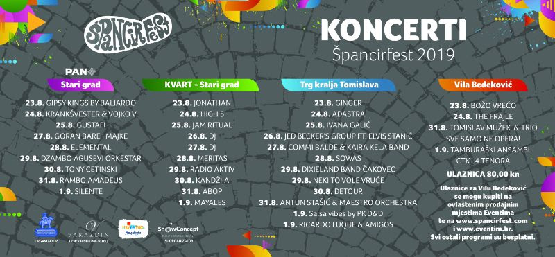 Na PAN pozornici kod Starog grada, središnjoj koncertnoj lokaciji su, nakon spektakularnog vatrometa, zasvirali The Gypsy Kings by Baliardo - world music atrakcija koja je u dugom nastupu nevjerojatnim zvukom, sviračkim umijećem, strašću, ali i poznatim pjesmama na ples pokrenula tisuće okupljene ispod zapadnog bedema. Tek što su odsvirani zadnji akordi na PAN pozornici na obližnju pozornici u KVART-u Špancirfesta popeli su se nevjerojatni Jonathan i u gotovo dva sata odsvirali genijalan, žestok, iskren i pamtljiv koncert. No, čast da otvore konertni niz na Špancirfestu pripala je varaždinskom bendu Ginger sastavljenom od sjajne mlade vokalistice Fani Solomun i vrhunskih glazbenika.