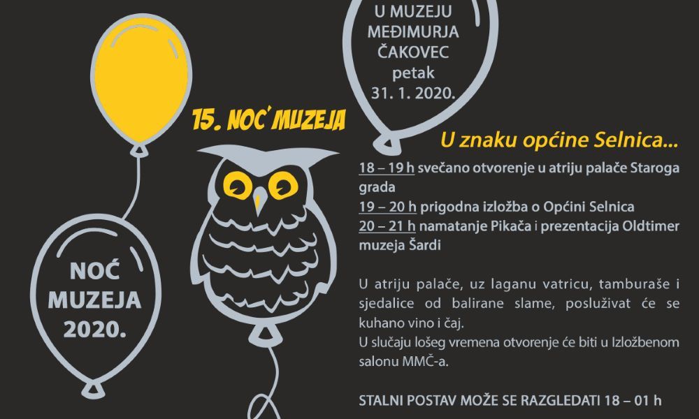 Ovogodišnja Noć muzeja u Muzeju Međimurja Čakovec u petak, 31. siječnja u znaku je općine Selnica. Predstavit će se kulturna, povijesna, vjerska, športska i gospodarska baština općine Selnica. Na taj način naš muzej nastavlja uhodanu koncepciju Noći muzeja predstavljanjem međimurskih općina.